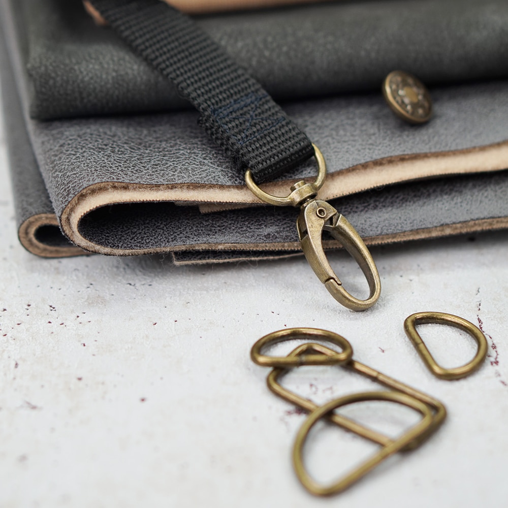 Einfache Anwendung: Legt ein zugeschnittenes Band um den D–Ring und fixiert es am besten mit ein paar Stichen rechts auf rechts an der gewünschten Stelle eurer Tasche. Anschließend könnt ihr die Taschenteile ganz normal zusammennähen. Mit einem Karabinerverschluss (25 mm – Altgold) könnt ihr euer Gurtband ganz einfach am Halbring und der Tasche befestigen.