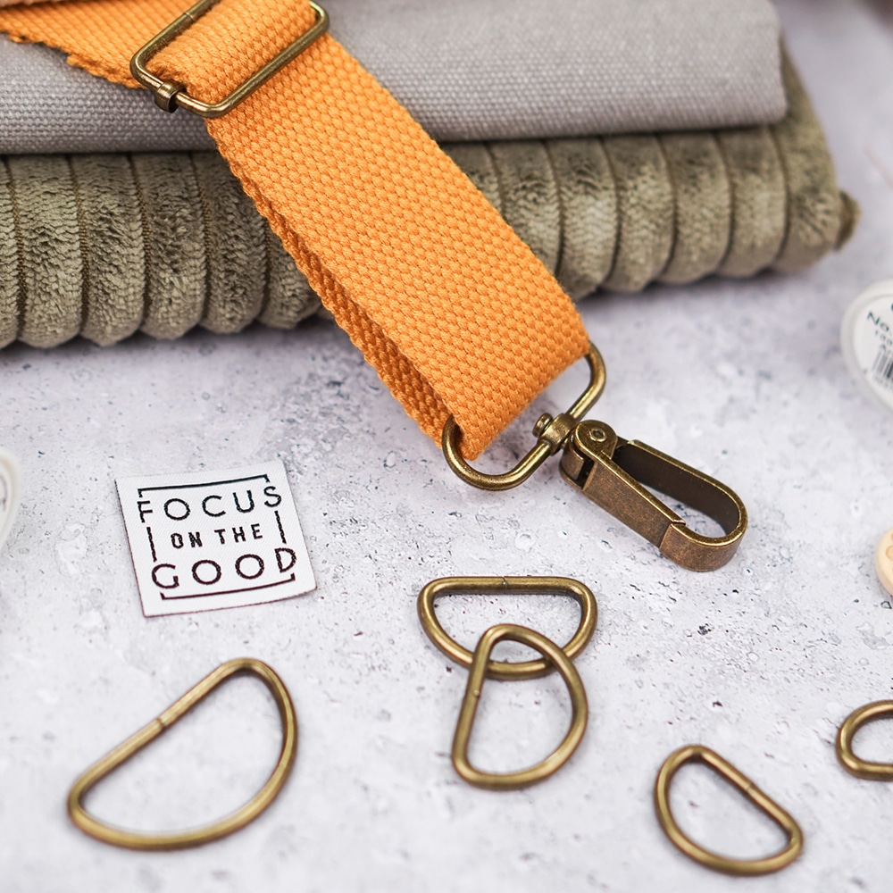 Die perfekte Ergänzung für Taschen, Rucksäcke: Mit dem D-Ring könnt ihr Gurtbänder wunderbar an euren DIY-Projekten befestigen. Aufgrund seiner Farbe in Altgold (Messing) passt er super zu vielen Outfits und Stoffen und kann auch mit unserem anderen Gurtband-Zubehör in Altgold kombiniert werden.