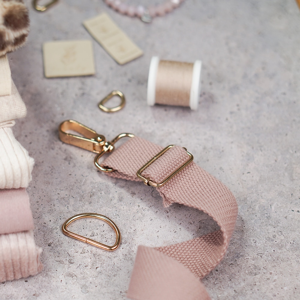 Einfache Anwendung: Legt ein zugeschnittenes Band um den D–Ring und fixiert es am besten mit ein paar Stichen rechts auf rechts an der gewünschten Stelle eurer Tasche. Anschließend könnt ihr die Taschenteile ganz normal zusammennähen. Mit einem Karabinerverschluss 32 mm könnt ihr euer Gurtband ganz einfach am Halbring und der Tasche befestigen.