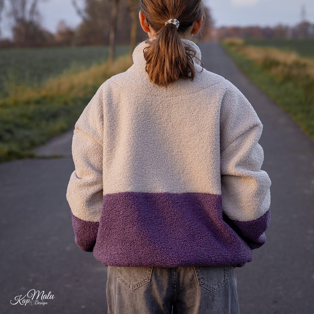 Dank der beiden weichen Stoffseiten, benötigt der Bouclé kein zusätzliches Futter und eignet sich auch hervorragend für dickere Projekte wie Sweater oder Troyer. Besonders schön wirkt er auch bei den Westen Wilmsy oder Winalea – einfach mit Paspelband einfassen, den Futterstoff weglassen und fertig ist der tolle Look.
