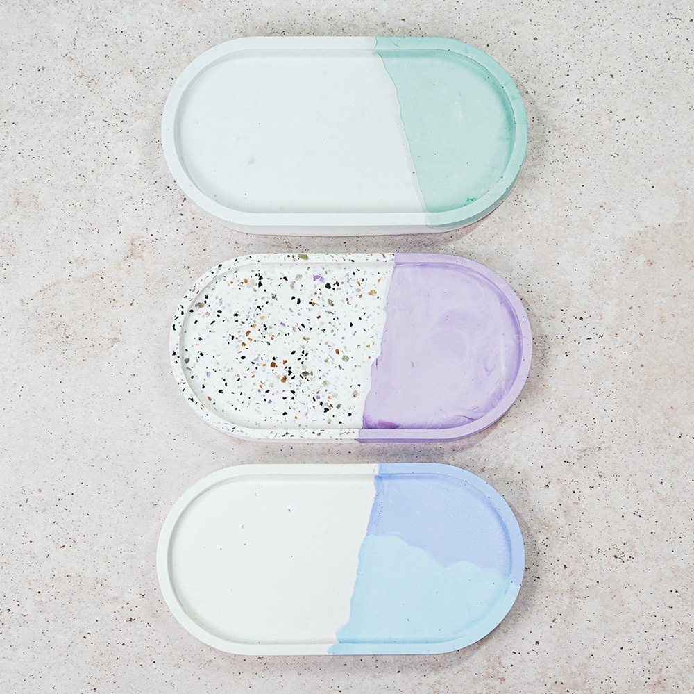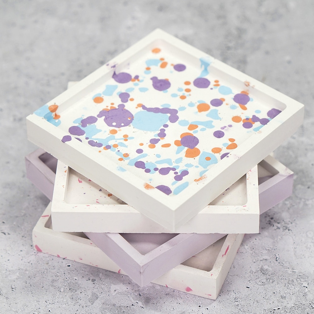 - Verwendet selbst hergestellten farbige Flakes (weißes Gießpulver Pulver + Farbpigmente) für eine moderne Terrazzo Optik.