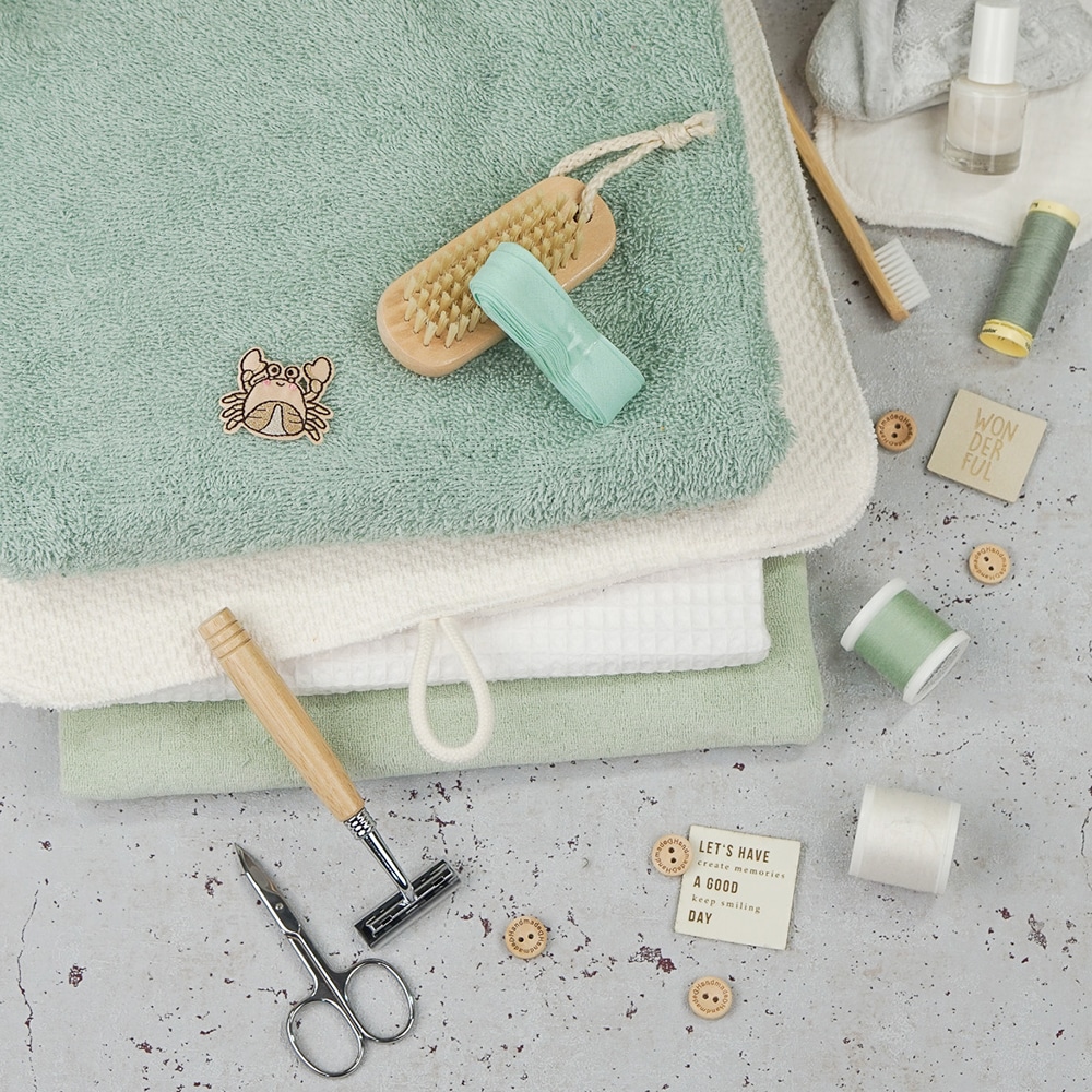 Selbst modische Kulturbeutel oder praktische Kosmetiktaschen sind hübsche Accessoires, die aus diesem Frottee genäht werden können (Tipp: verstärkt den Frottee mit Vlies).