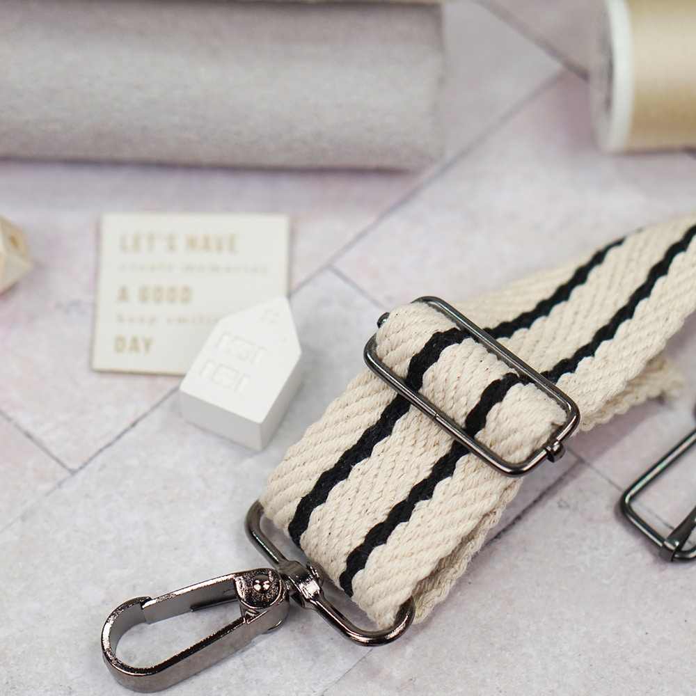 Start » Shop » Zutaten & Zubehör » Bänder und Kordeln » Gurtbänder » Gurtband Baumwolle – 38 mm – SCHMALE STREIFEN – Natur/Schwarz