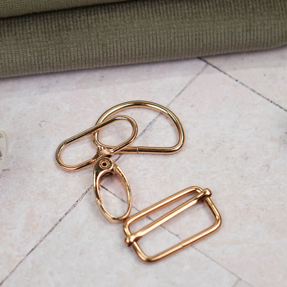 Dieses Gurtbandzubehör-Set aus Metall in Shiny Gold eignet sich wunderbar zum Befestigen von Gurtbändern an Hand-/Sporttaschen, Shoppingbags, Handytaschen oder Rucksäcken. Das Set besteht aus zwei Karabinern, zwei D-Ringen und einer Leiterschnalle mit einem jeweiligen Lochdurchmesser von 32 mm.