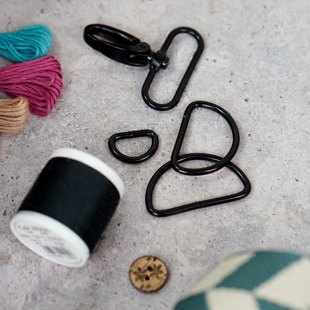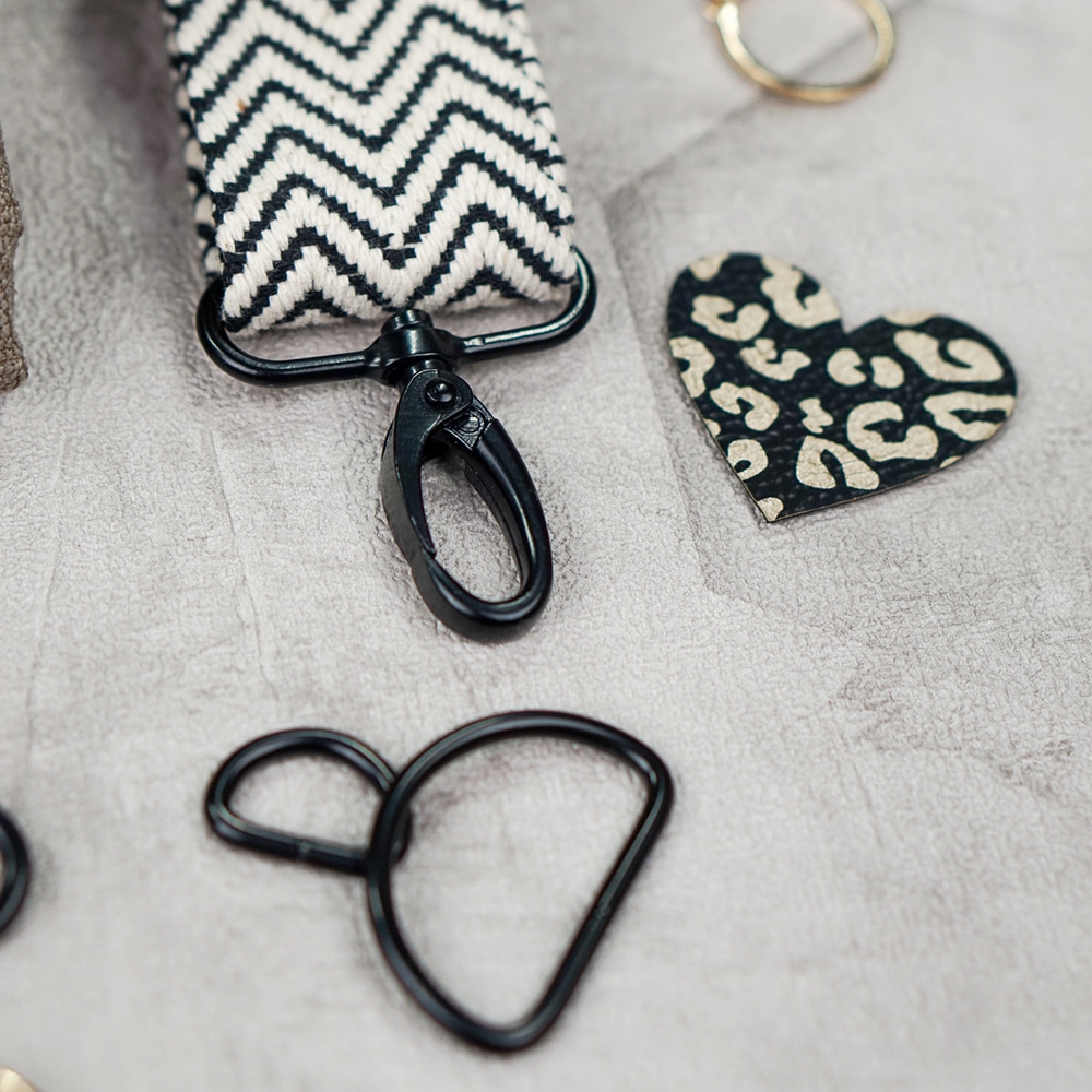 Dieses Gurtbandzubehör-Set aus Metall in Schwarz Matt eignet sich wunderbar zum Befestigen von Gurtbändern an Hand-/Sporttaschen, Shoppingbags, Handytaschen oder Rucksäcken. Das Set besteht aus zwei Karabinern, zwei D-Ringen und einer Leiterschnalle mit einem jeweiligen Lochdurchmesser von 38 mm.