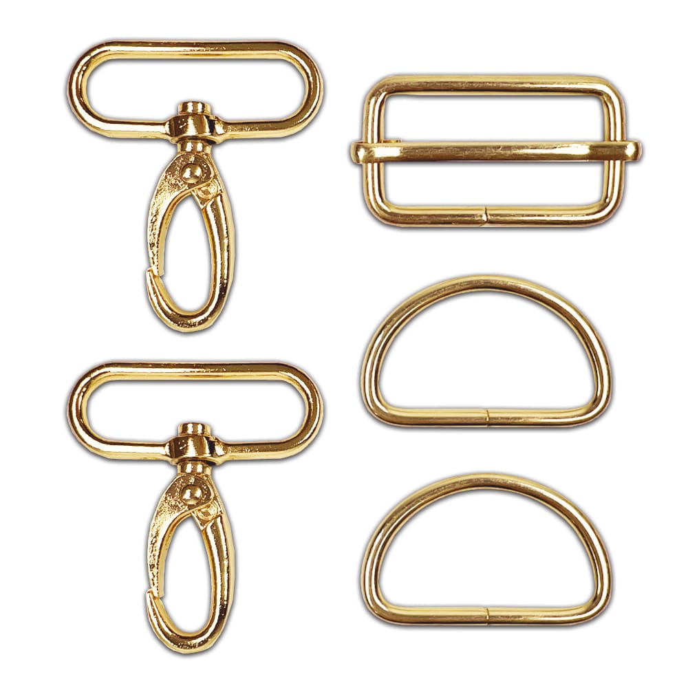 Dieses Gurtbandzubehör-Set aus Metall in Shiny Gold eignet sich wunderbar zum Befestigen von Gurtbändern an Hand-/Sporttaschen, Shoppingbags, Handytaschen oder Rucksäcken. Das Set besteht aus zwei Karabinern, zwei D-Ringen und einer Leiterschnalle mit einem jeweiligen Lochdurchmesser von 38 mm.