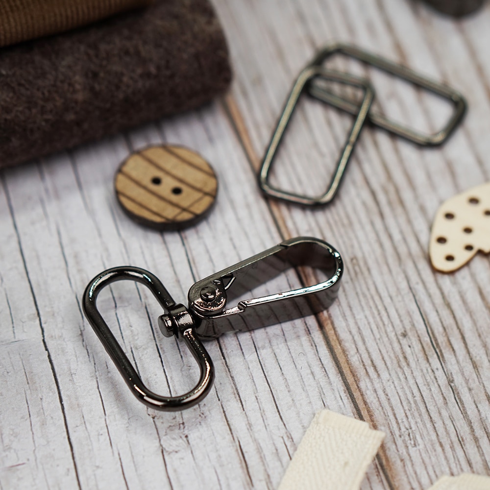 Der drehbare Karabiner aus Metall in der Farbe Anthrazit (Messing) eignet sich wunderbar zum Befestigen von Gurtbändern an Hand-/Sporttaschen, Shoppingbags, oder Rucksäcken. Dieser Karabiner ist mit einem Lochdurchmesser von 32 mm somit ein praktisches Utensil für verschiedene Alltagssituationen.