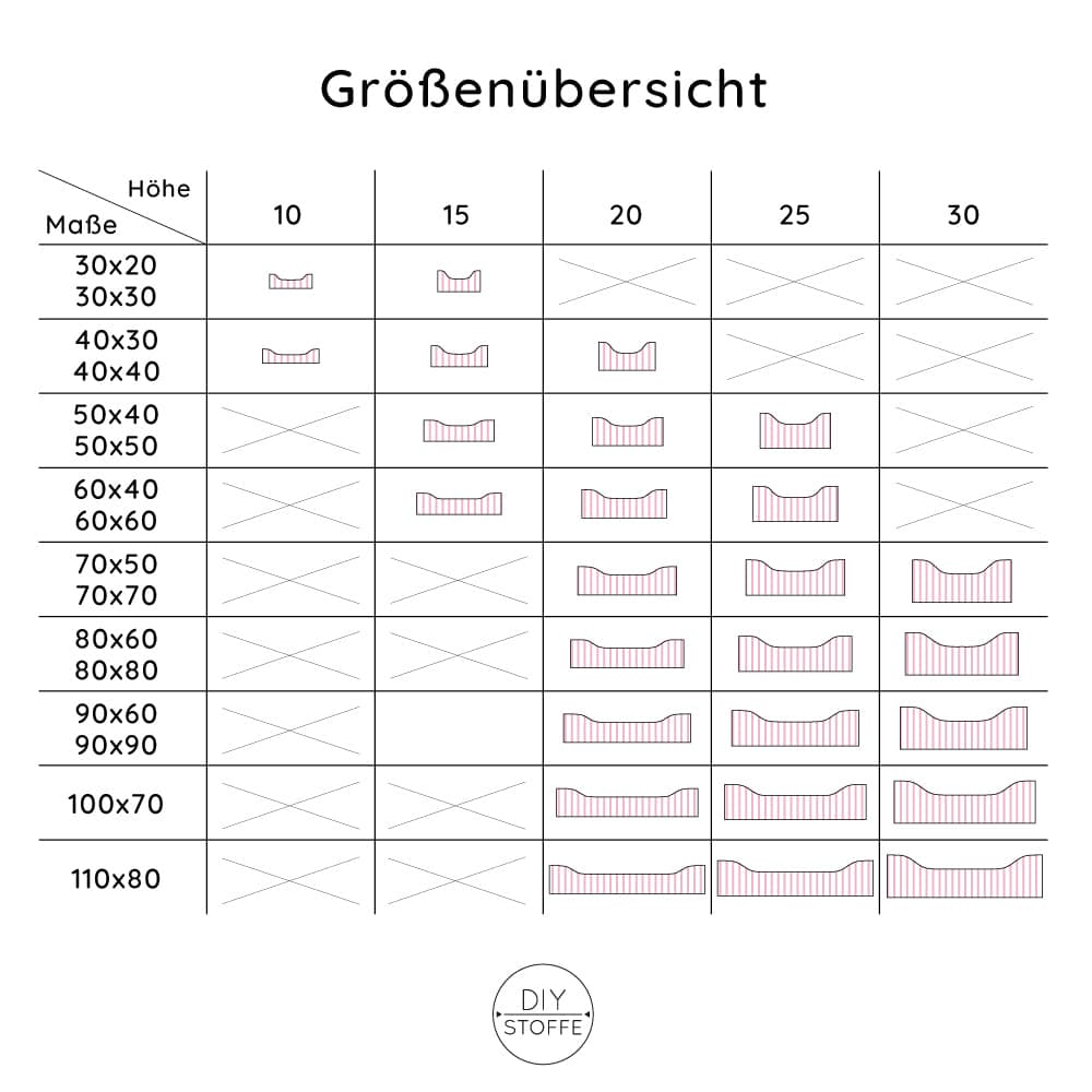 - Das Körbchen kann rechteckig oder quadratisch genäht werden. (Außer die Größe 100 cm und 110 cm, diese gibt es nur in rechteckiger Variante.)
