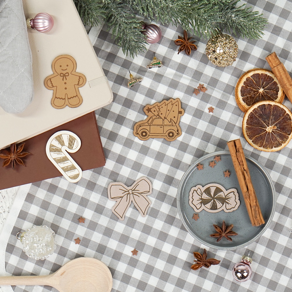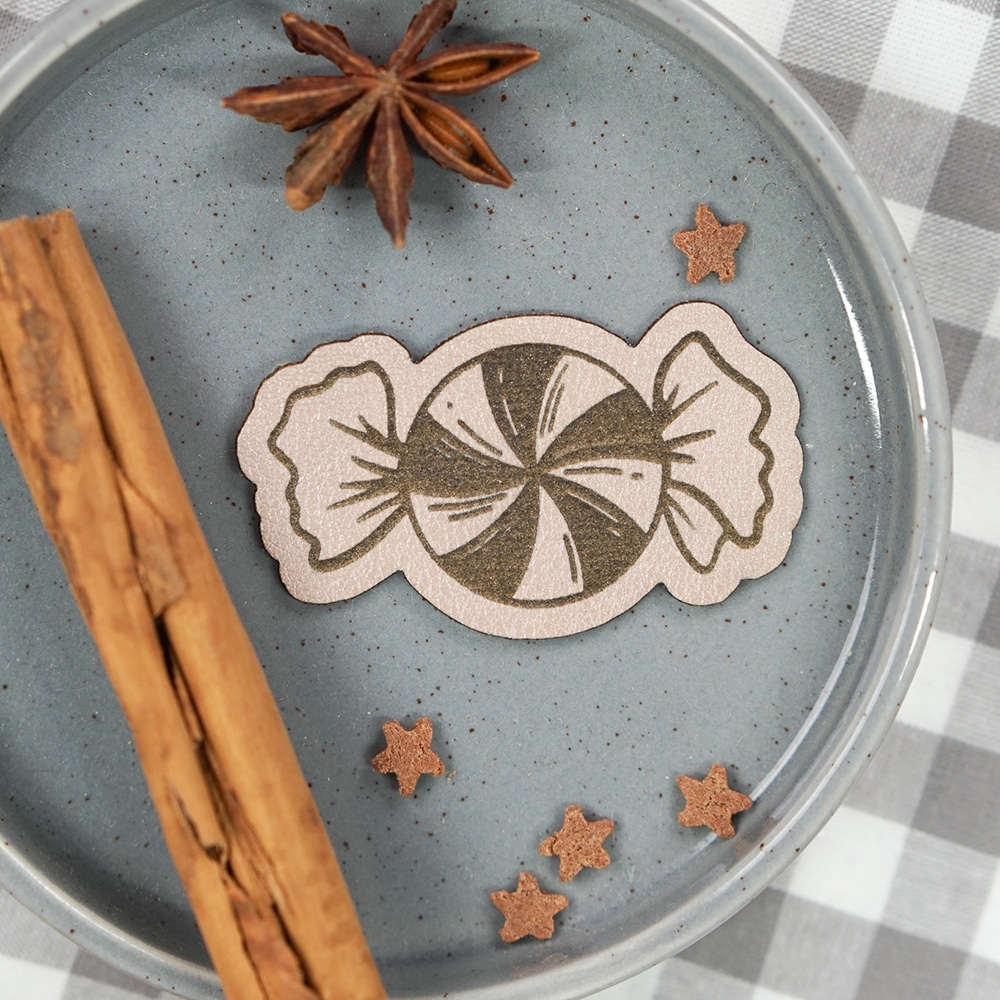 Das Label „Bonbon“ ist der Hingucker auf selbst genähten Stücken, wie zum Beispiel der Beanie Noel. Auch auf festlichen Kleidchen, Latzhosen, Handschuhen oder Stirnbändern ist das Label mit seinem zeitlosen Design ein Highlight. Es besteht aus einem Rosé Metallic Kunstleder und ist waschbar. Wir empfehlen, das Label vor dem Aufnähen mit dem wasserlöslichen Fixiermarker zu befestigen. Damit wird das Aufnähen leicht gemacht.