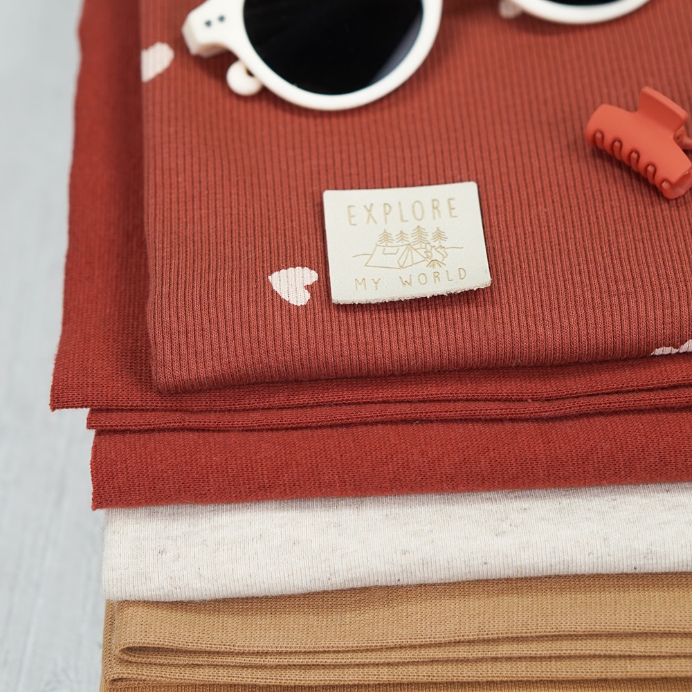 Das Label „EXPLORE MY WORLD“ ist der Hingucker auf selbst genähten Stücken, wie zum Beispiel der Beanie Noel. Es besteht aus einem hellem Kunstleder und ist somit waschbar. Wir empfehlen, das Label vor dem Aufnähen mit dem wasserlöslichen Fixiermarker zu befestigen. Damit wird das Aufnähen leicht gemacht. Auch auf Latzhosen, Handschuhen oder Stirnbändern ist das Label mit seinem zeitlosen Design ein Highlight.