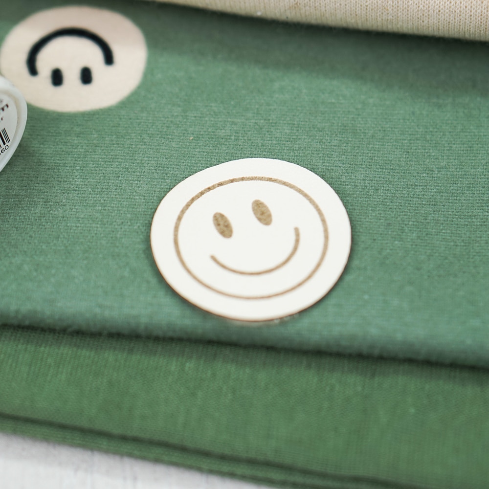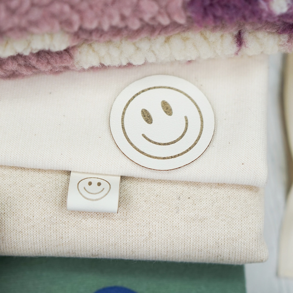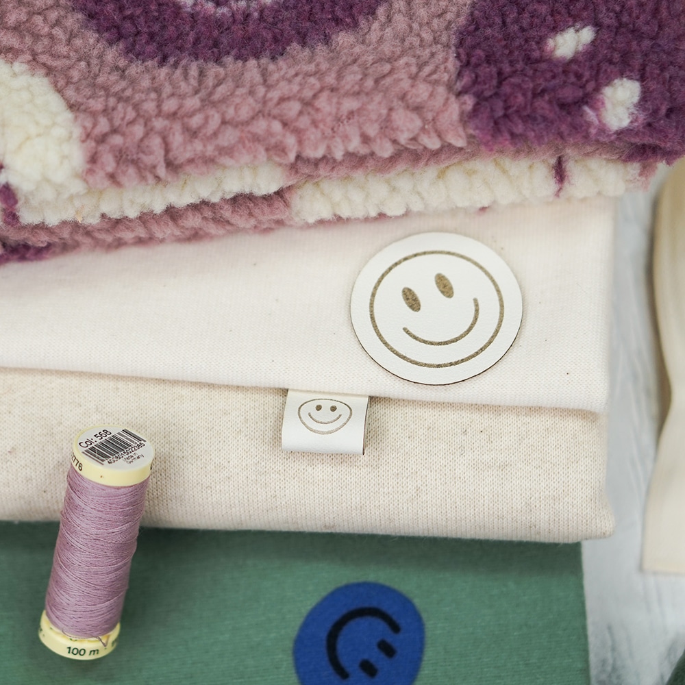 Das Label „Happy Face“ ist der Hingucker auf selbst genähten Stücken, wie zum Beispiel der Beanie Noel. Auch auf Kleidchen, Latzhosen, Handschuhen oder Stirnbändern ist das Label mit seinem zeitlosen Design ein Highlight. Es besteht aus einem wollweißem Kunstleder und ist waschbar. Wir empfehlen, das Label vor dem Aufnähen mit dem wasserlöslichen Fixiermarker zu befestigen. Damit wird das Aufnähen leicht gemacht.
