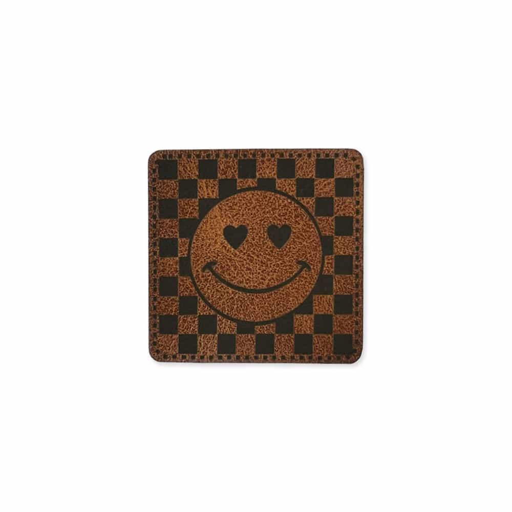 Label „Schachbrett Happy Face“ – 40 x 40 mm – Dunkles Lederbraun