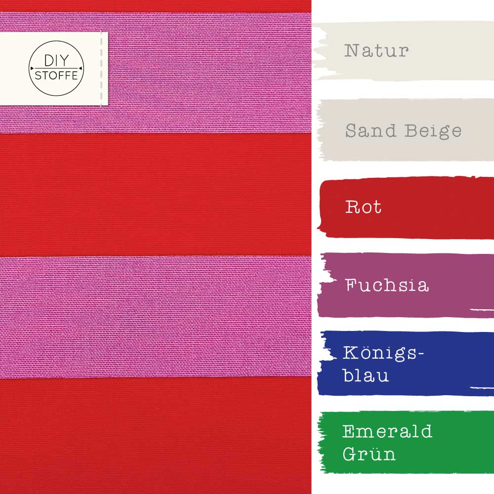 Blockstreifen zieren diesen leichten Canvas, der somit ein echter Hingucker wird und sich bestens Dekostoff für beispielsweise Kissenbezüge, Utensilos und Taschen eignet. Das Mischgewebe ist nicht nur atmungsaktiv und stabil, sondern aufgrund seiner Struktur auch langlebig. Da dieser Canvas leicht ist, lassen sich sogar Kleider oder Röcke wunderbar daraus nähen.