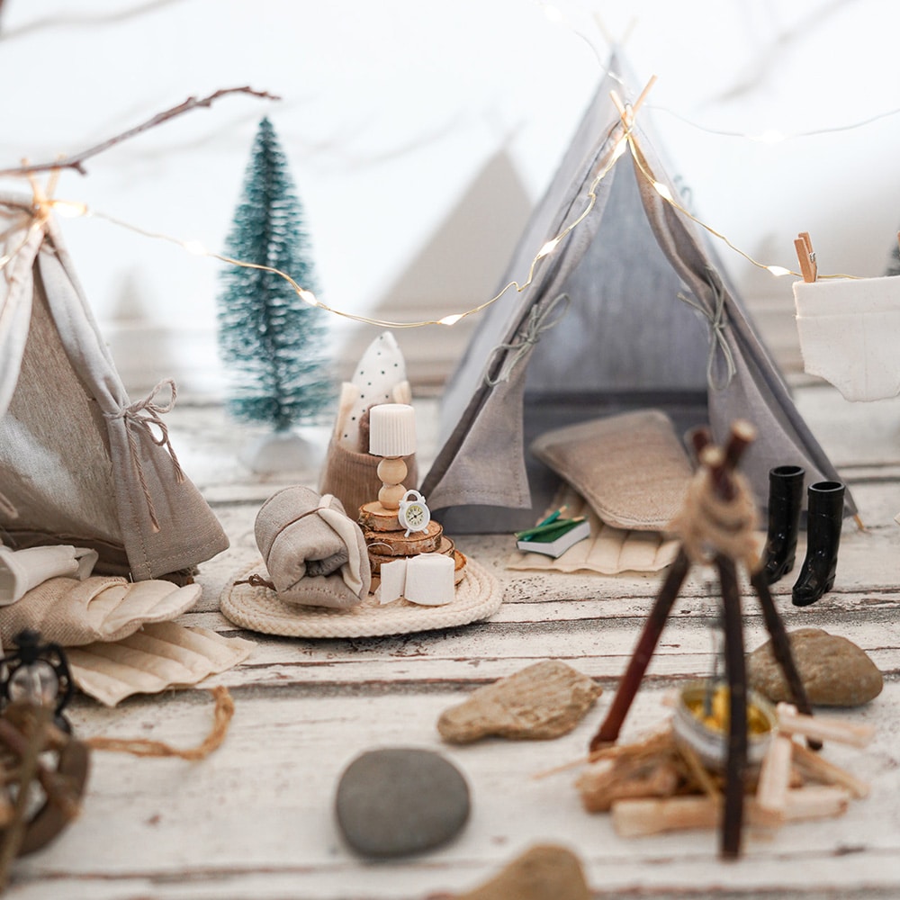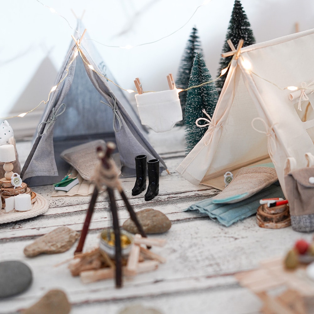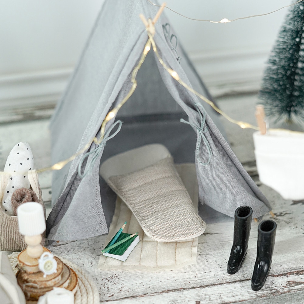 - Nach einem langen Tag voller Abenteuer zieht sich der Wichtel in sein gemütliches Zelt aus Baumwollstoff zurück – sein kleines Zuhause für traumhafte Nächte im Miniatur-Abenteuerland.