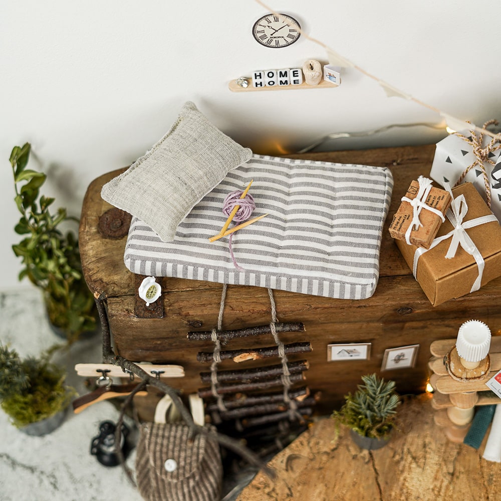 - Maße: Matratze (L-12 cm x B-6,5 cm x H-15 cm), Bettdecke (L-11 cm x H-11 cm) & Kopfkissen (H-4,5 cm x B-7 cm).