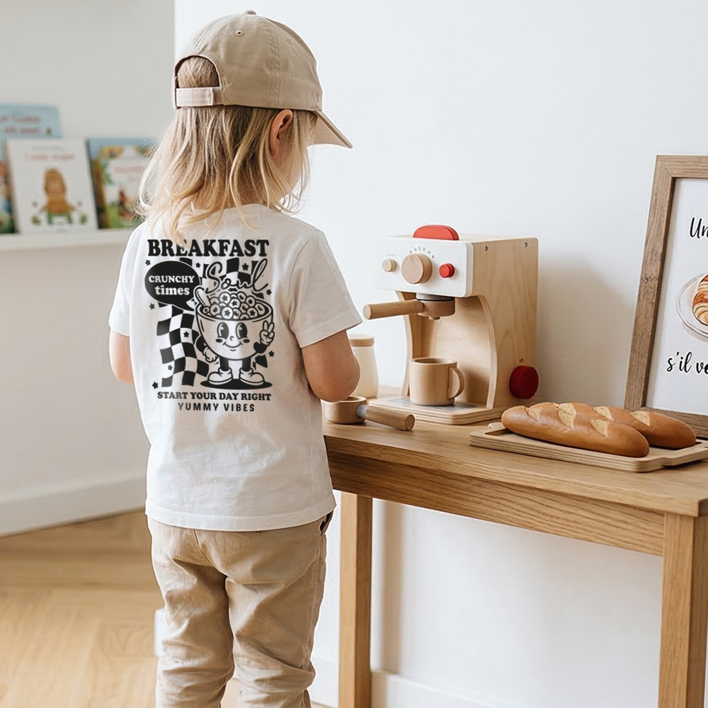 Mit dem Plottermotiv Breakfast soul setzt ihr ein angesagtes Statement auf Kleidung und Deko. Das angesagte Design mit witzigen Illustrationen und cooler Typografie sorgt für gute Laune und macht jedes Teil zu einem echten Hingucker – perfekt für kleine Frühstücks-Fans und entspannte Good-Morning-Vibes.