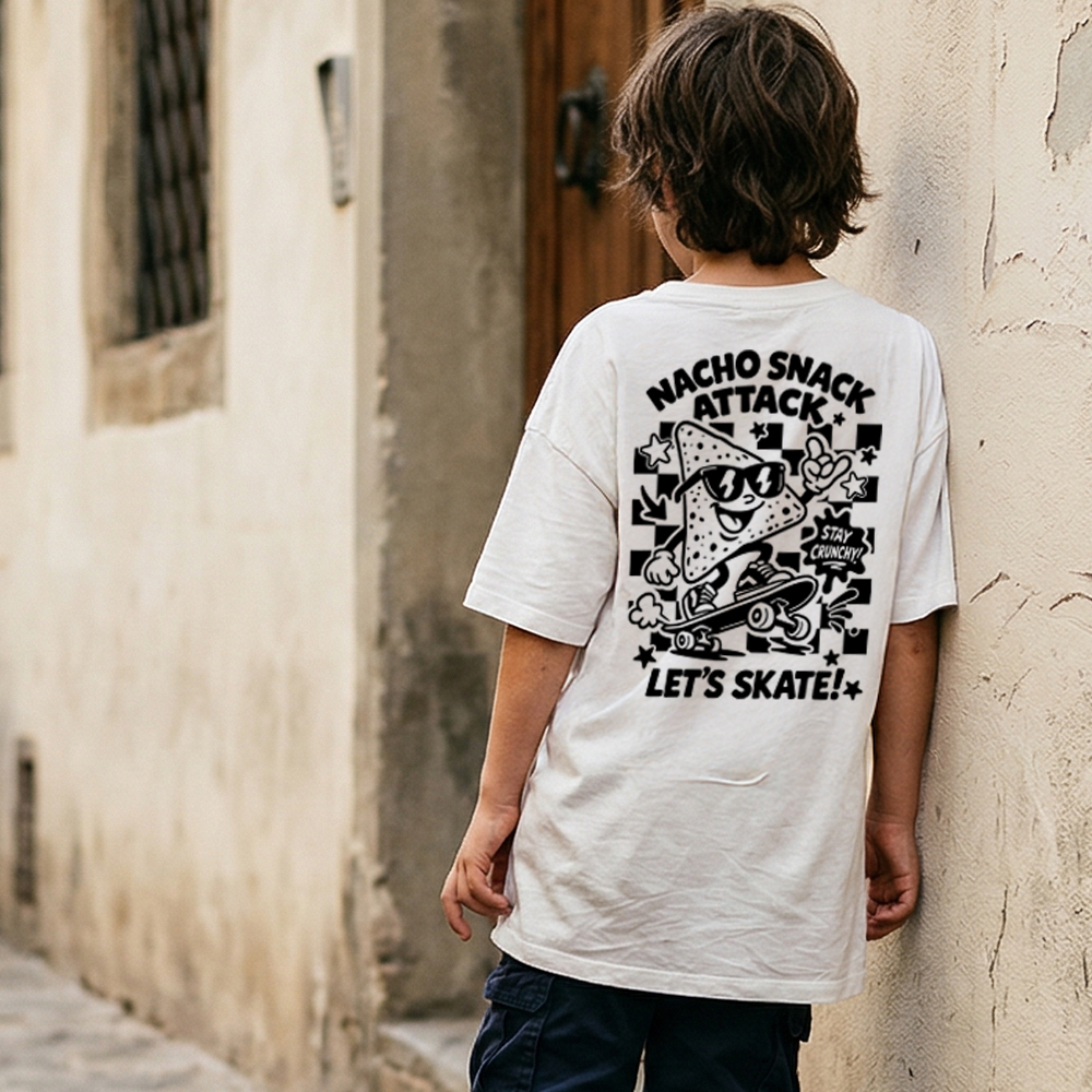 Mit dem Plottermotiv Nacho Snack Attack bringt ihr lässige Skater-Vibes auf Kleidung und Deko. Das coole Design mit dem stylischen Nacho-Character auf dem Skateboard, kombiniert mit moderner Typografie, sorgt für jede Menge gute Laune und macht jedes Teil zum echten Hingucker – perfekt für kleine Skater-Fans und alle, die es entspannt und verspielt mögen.