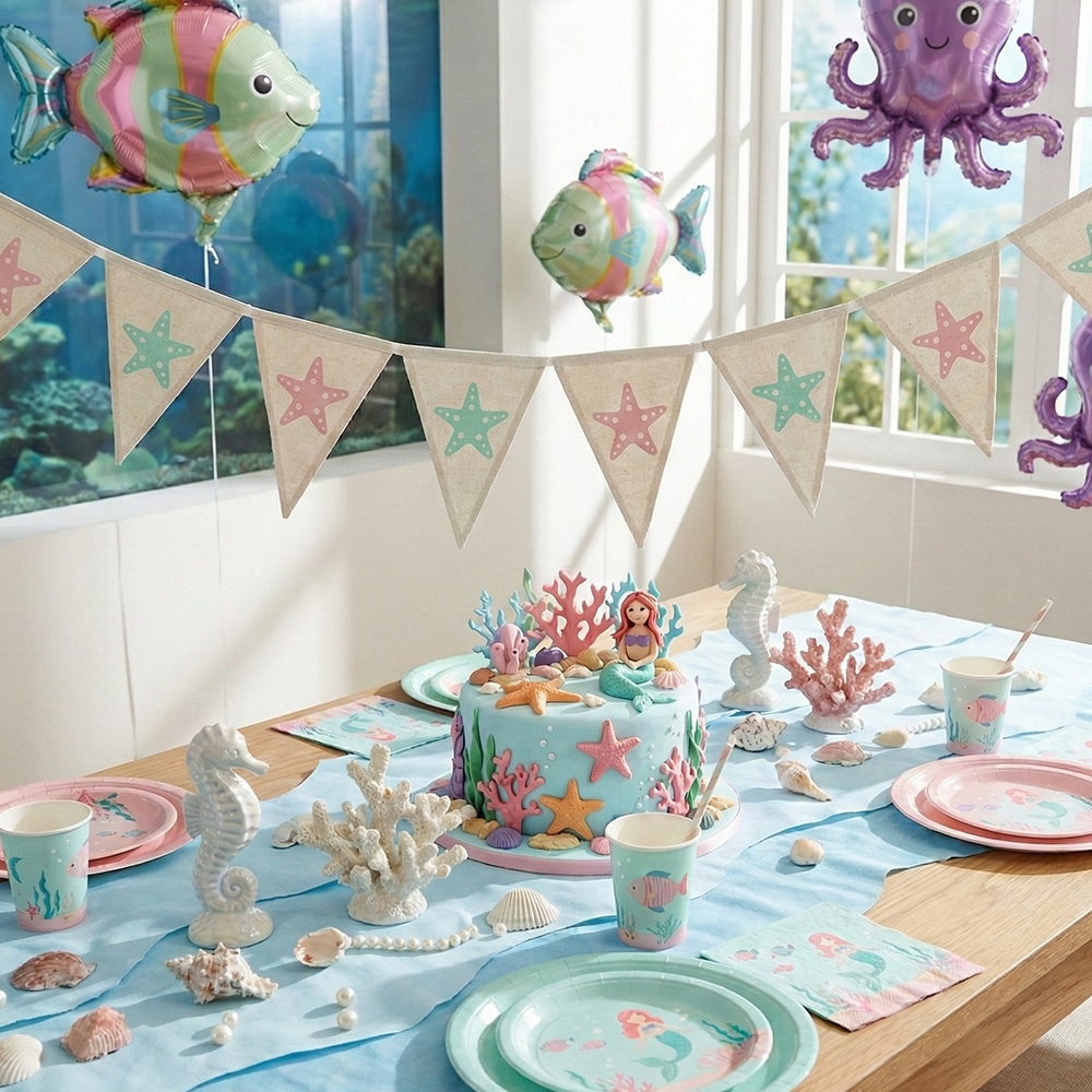 - Für besondere Anlässe könnt ihr mit den Motiven auch Wimpelketten, Platzdeckchen oder Tischläufer gestalten – ideal für Geburtstagsfeiern, Einschulungen oder Mottopartys im Unterwasser-Stil
