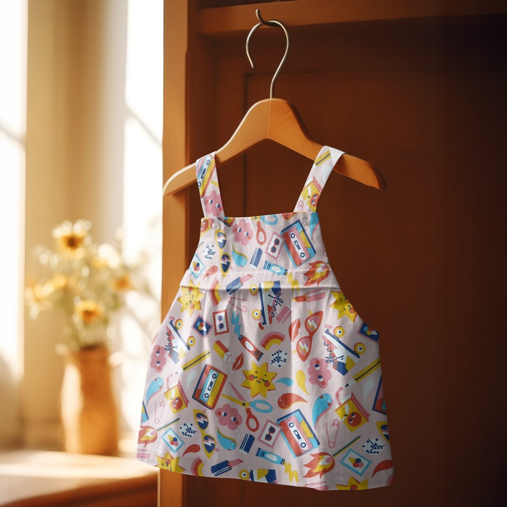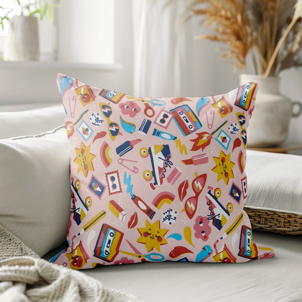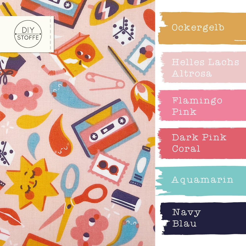 Diese Popeline im angesagten 80’s Style ist ein leicht fallender Baumwollstoff aus 100% Baumwolle. Das auffällige Muster mit bunten Rollschuhen, Kassetten und weiteren Retro-Elementen macht den Stoff zu einem echten Hingucker.