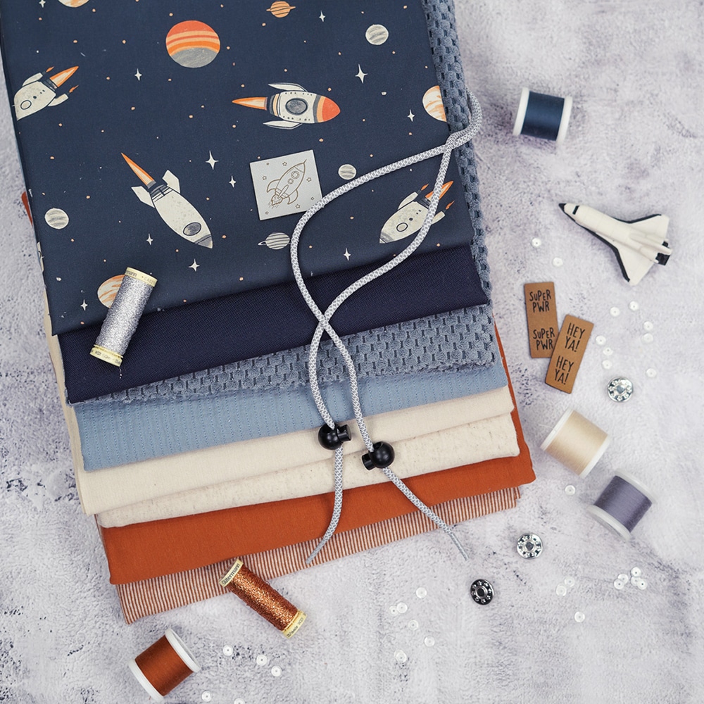 - Für den kosmischen Anzug benötigt ihr nur zwei Schnittmuster: Sweater Paule und Hose Levin in weißem French Terry kombiniert schwarzen Bündchen.