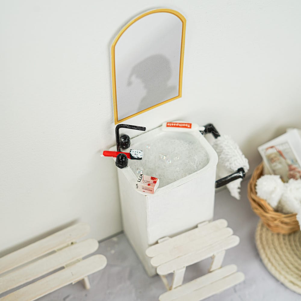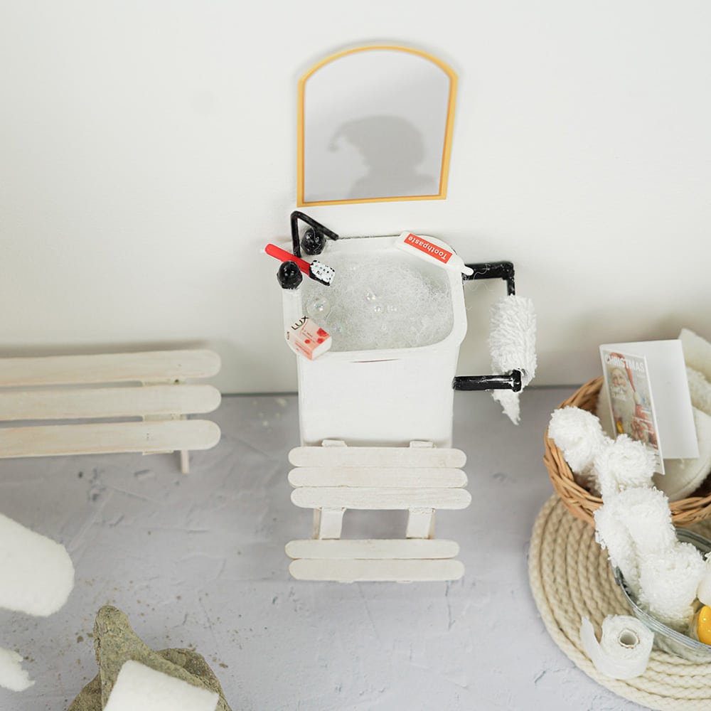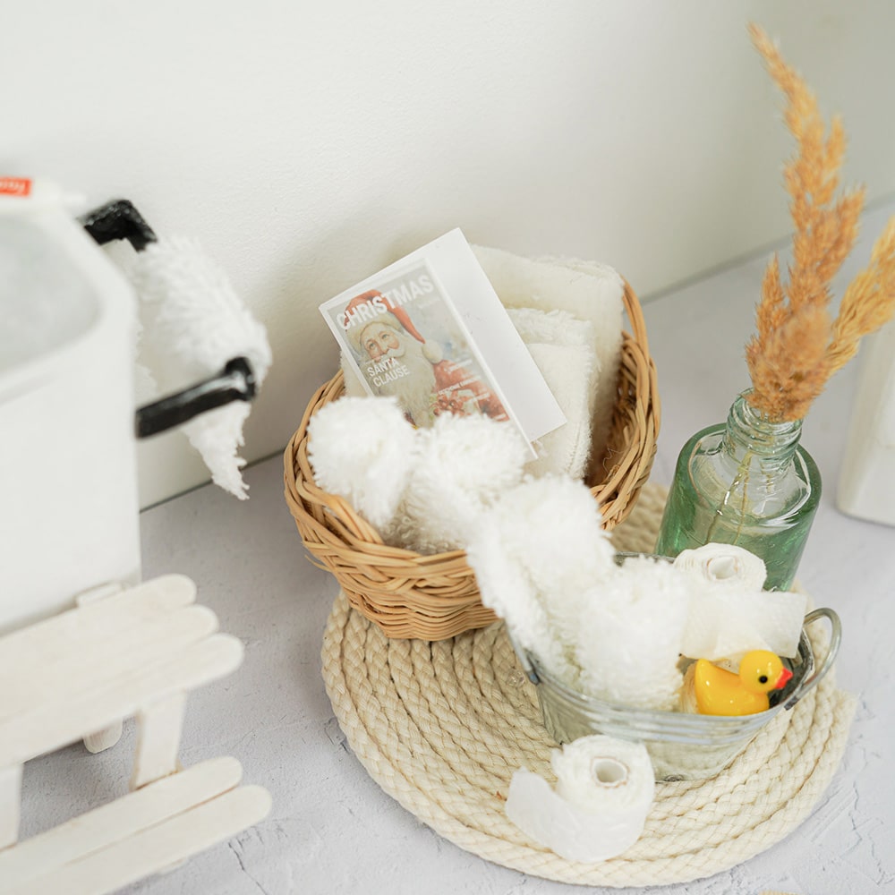 Für den richtigen Start in den Tag prüft der Wichtel auch schnell sein Gewicht auf der winzigen Waage, bevor er es sich mit einem Weihnachts-Magazin gemütlich macht. Und lässt sich da im Spiegel etwa sein Spiegelbild erahnen? Die kleinen Details verleihen dem Wichtel-Zuhause eine besondere Magie und lassen erahnen, wie der Wichtel seine Ruhe genießt, bevor er sich in die Weihnachtsvorbereitungen stürzt.