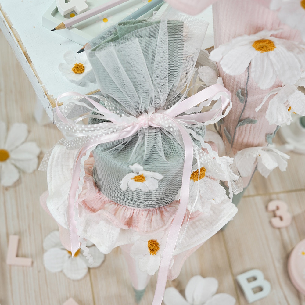 Luftig und leicht wird der Schulanfang mit der Schultüte Schmetterlinge, die an eine Blumenwiese erinnert. Zarte Farben, filigrane Tüll-Blumen sowie funkelnde Schmetterlinge verwandeln die Schultüte zu einem märchenhaften Traum. Mit Stoffmalfarben und verschiedenen Bändern sorgt ihr für weitere schöne Details.