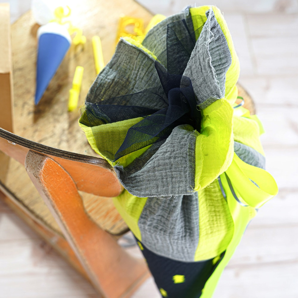 Die gelbe Schleife im Neon-Look bringt die Blitz-Schultüte richtig zum Strahlen und setzt sie perfekt in Szene. Ein reflektierendes Band, welches zwischen Tülle und Hauptteil eingenäht ist, sorgt für funkelnde Details.
