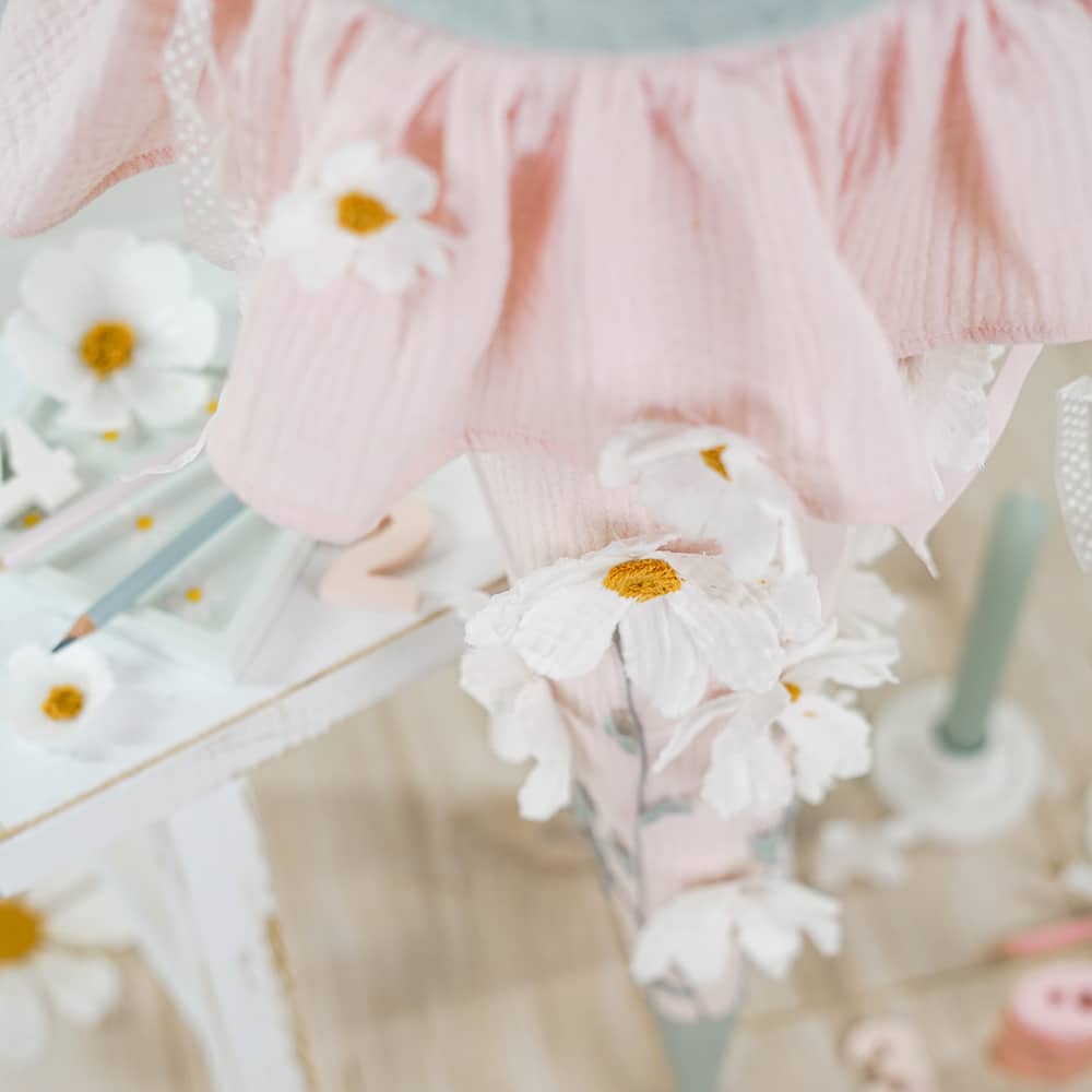 Mit der Schultüte Daisies wird der erste Schultag einfach zauberhaft schön. Der zarte Musselin in Cotton Rose kombiniert mit Musselin in Altmint verleiht der Schultüte einen wunderschönen, pastelligen Look.