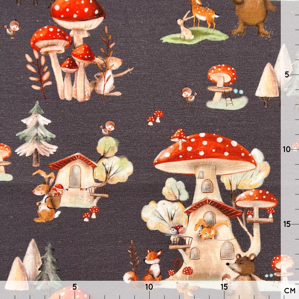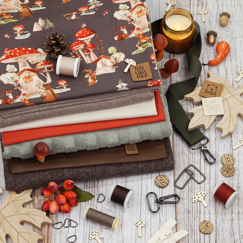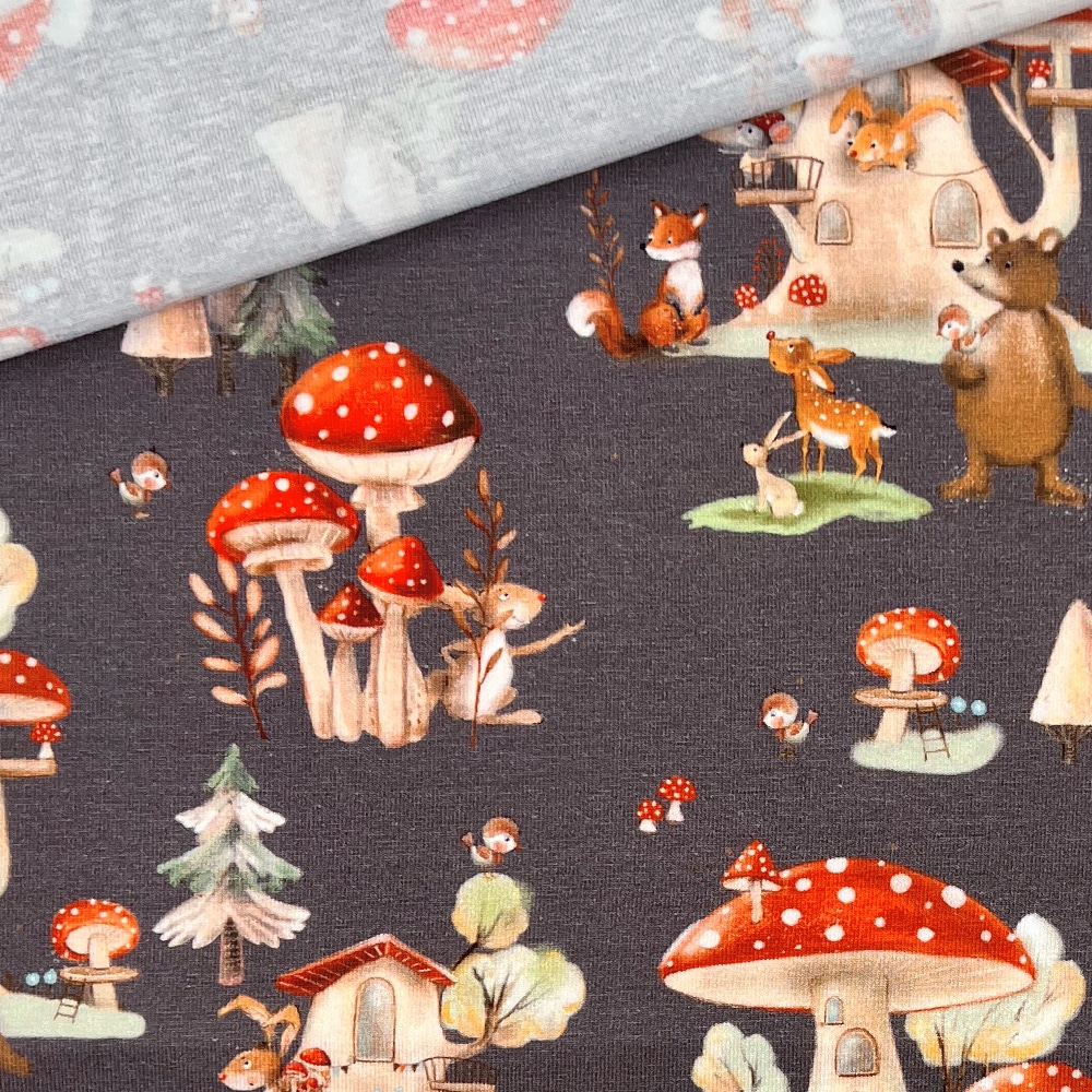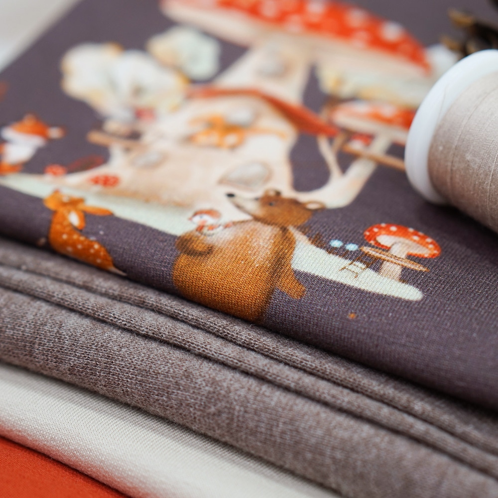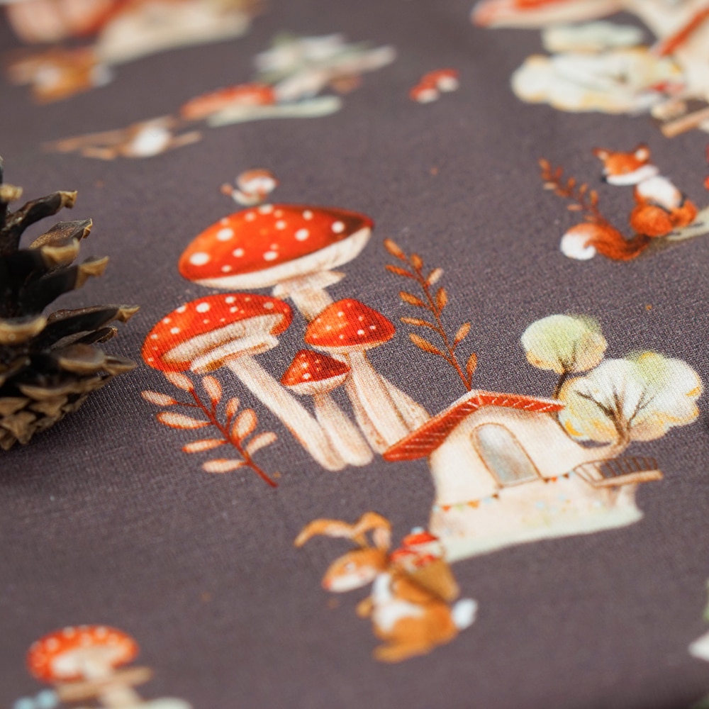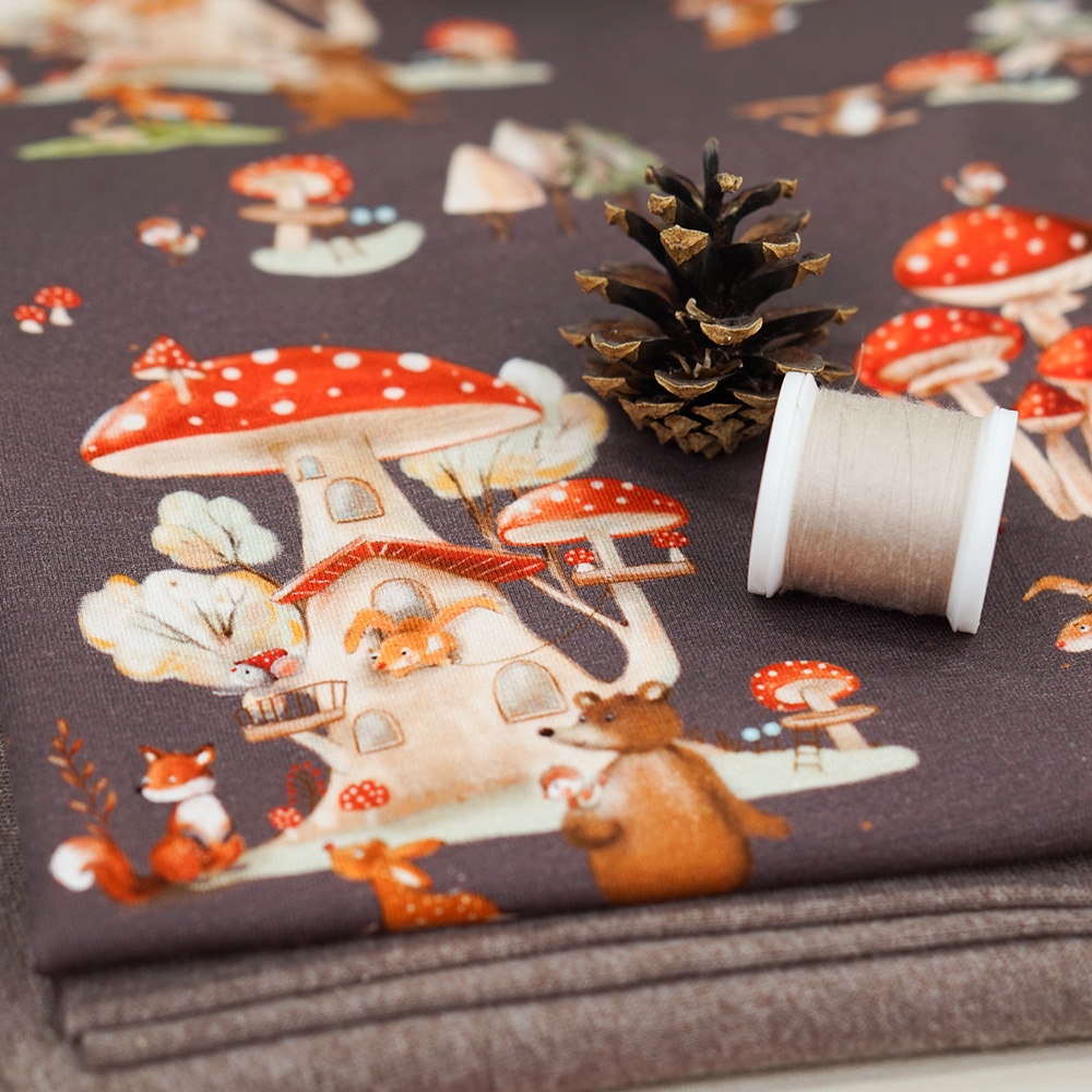 Besonders schön kommt dieser herbstliche Stoff mit seinen süßen Waldtieren und kleinen Pilzhäusern zur Geltung – perfekt für gemütliche Outfits in der kühleren Jahreszeit.