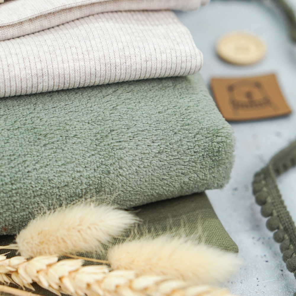 Dieser Teddyfleece-Plüsch ist ein wunderschöner kuscheliger Stoff, der wunderbar warm hält und sich angenehm weich auf der Haut anfühlt. Dieses Fleece zeichnet sich durch seine zwei weichen Seiten – rechte Stoffseite kuscheliger Teddyfleece, linke Stoffseite samtiger Plüsch – aus. Daher ist es hervorragend für gemütliche Nähprojekte wie Kuschel- oder Babydecken, Hausanzüge, Boho-Westen und Hoodies geeignet. Aber auch als Futterstoff für Jacken, Outdoor-Westen, Overalls oder Mäntel könnt ihr das Fleece super verwenden. Mützen, Schals und Handschuhe sind ebenfalls tolle Nähprojekte aus diesem Stoff. Er eignet sich auch super für eine kuschelige Innenseite in Hundekörbchen.