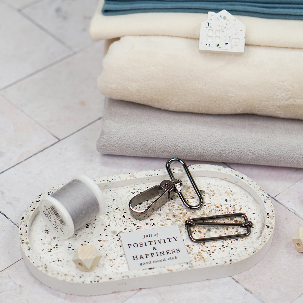 - Für diese Tasche legt ihr jeweils 0,5 m (1 Einheit) von dem Außenstoff und dem Futterstoff in den Warenkorb. Die Schieber benötigt ihr 2x. Die restlichen Zutaten werden 1x benötigt.